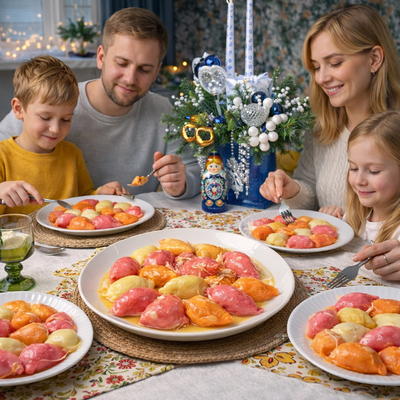 Вся семья собирается за столом и кушает вареники с сюрпризами.
