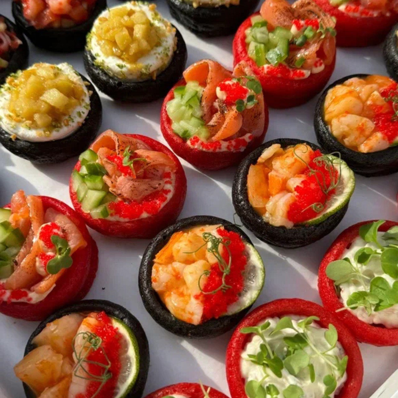 - Тарталетки с креветками, лососевым риетом и черри 6 шт